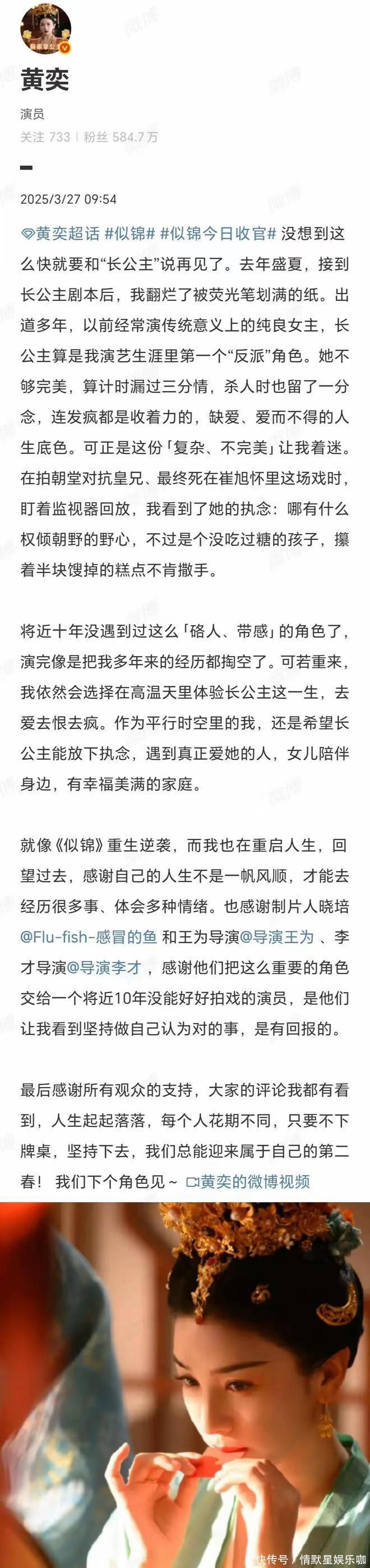 黄奕可以说是这部剧最大的惊喜,演的长公主太有张力了。黄奕也很舍不得收官,洋洋洒洒写了上千字表达自己感受。表示出道多年,以前经常演传统意义上的纯良女主,长公主算是她演艺生涯里第一个“反派”角色。她不够完美,算计时漏过三分情,杀人时也留了一分念,连发疯都是收着力的,缺爱、爱而不得的人生底色。可正是这份「复杂、不完美」让她着迷。